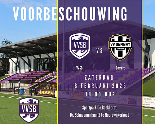 Zaterdag 8 Februari speelt VVSB een thuiswedstrijd tegen Gemert. Op ons eigen sportpark de Boekhorst zal om 18:00 worden afgetrapt.